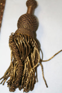 Today during examination it was discovered the the stars were formerly detailed with silver foil wrapped cotton thread. Only a limited amount of the thread remains. Additional, the stars on the reverse are made from feed sack material. One star shows a print line in it. See http://www.iowavalor/ for the full story.